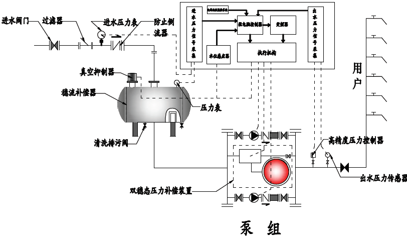 另外如設(shè)備原理圖所示,通過微機(jī)控制、雙穩(wěn)態(tài)壓力補(bǔ)償裝置及真空補(bǔ)償系統(tǒng),使本設(shè)備可以和自來水直接串接,因水泵工作的疊加原理,使設(shè)備可以充分利用自來水原有的壓力,增加了變頻調(diào)速給水設(shè)備的節(jié)能點(diǎn)。當(dāng)自來水壓力不足致使壓力下降時(shí),本設(shè)備通過真空抑制器及穩(wěn)流補(bǔ)償器中的檢測裝置采集穩(wěn)流補(bǔ)償器內(nèi)的水位信號(hào),通過微機(jī)控制真空抑制器及雙穩(wěn)態(tài)壓力補(bǔ)償裝置中的的特殊裝置動(dòng)作,抑制負(fù)壓的產(chǎn)生,保證設(shè)備不對(duì)城市管網(wǎng)產(chǎn)生任何影響。