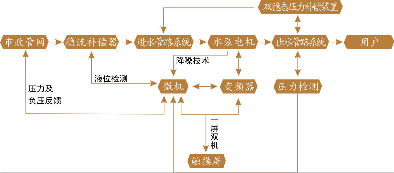 無負(fù)壓供水設(shè)備采用微機(jī)變頻技術(shù)、降噪技術(shù)、一屏雙機(jī)技術(shù)、雙穩(wěn)態(tài)壓力補(bǔ)償技術(shù)、負(fù)壓處理技術(shù)實(shí)現(xiàn)無負(fù)壓供水。通過觸摸屏顯示運(yùn)行狀態(tài),通過微機(jī)控制、雙穩(wěn)態(tài)壓補(bǔ)償裝置及真空補(bǔ)償系統(tǒng),實(shí)現(xiàn)了與自來水管網(wǎng)直接串接,并且克服了對(duì)管網(wǎng)的不良影響。